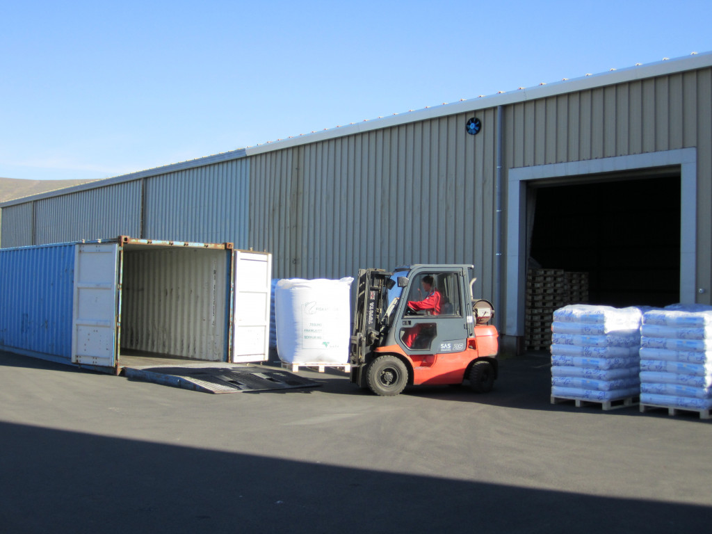 Jói keyrir fóðri í gám sem sendist suður á land.